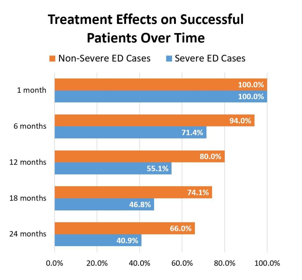 Various clinical studies have been conducted since 2010, and shown that the effects of ESWT treatment of ED can last beyond 6 months, in some cases even beyond 12 months. In a recent study, 94% of patients with non-severe cases of ED showed lasting success after 6 months. 71.4% patients with severe cases of ED showed lasting success after 6 months. (Refer to the bottom of the web page for clinical study title)